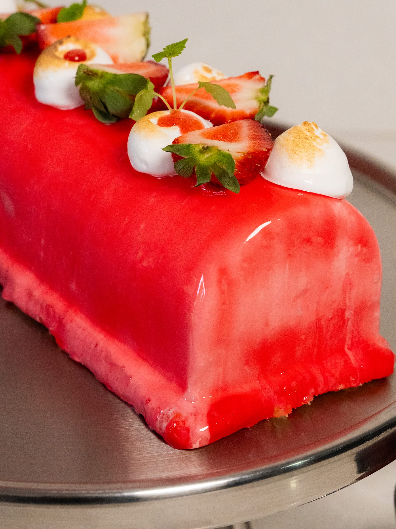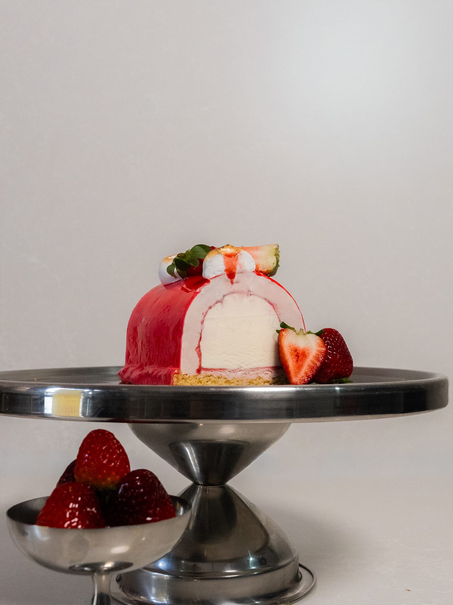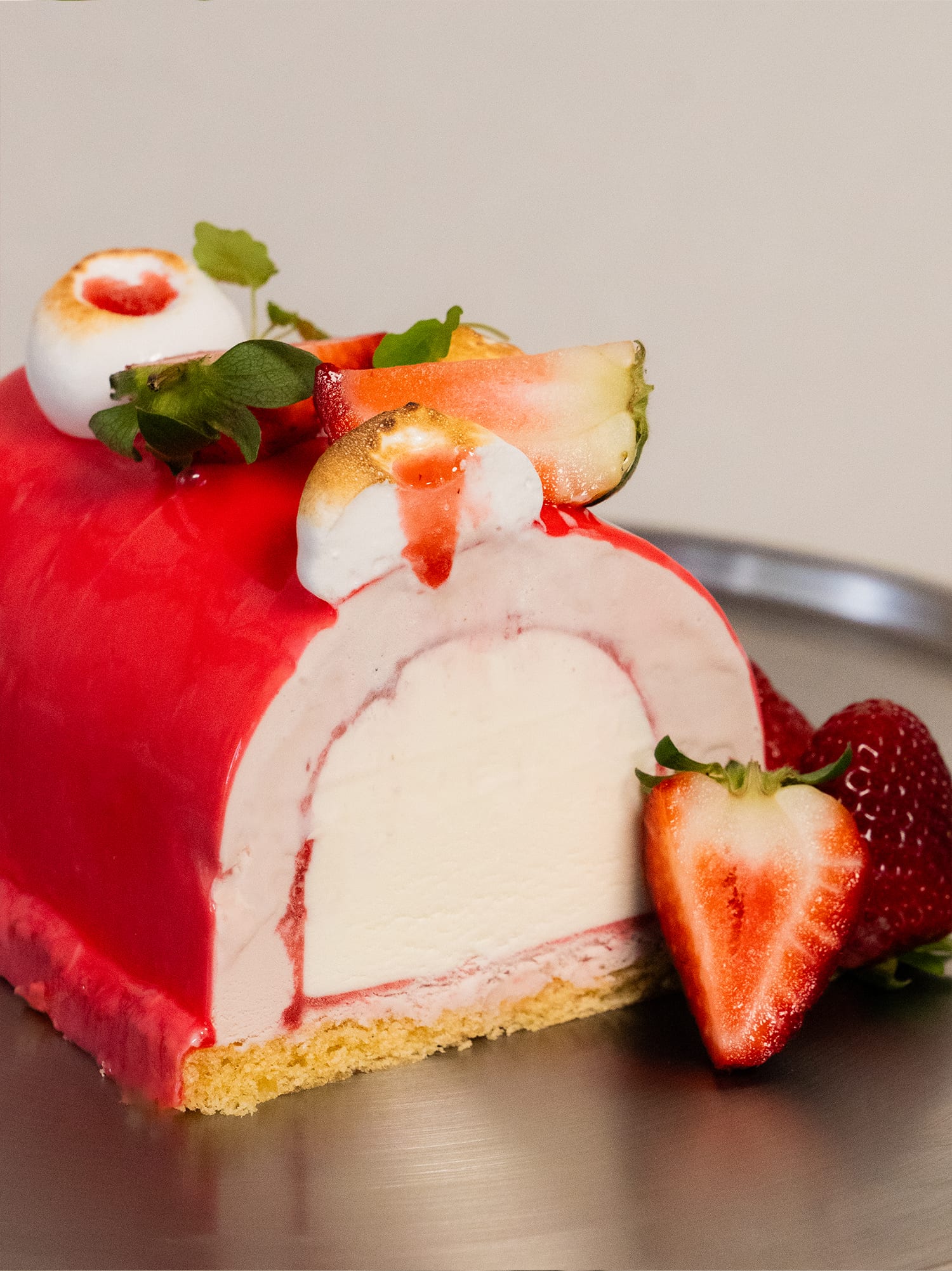 Handmade and elegant, this cake is glazed with a shiny red-and-white chocolate finish. Inside, it features a refreshing layer of strawberry gelato made with fresh fruit, paired with a creamy Fior di Latte gelato for balance and smoothness. Topped with torched meringue and strawberry coulis.